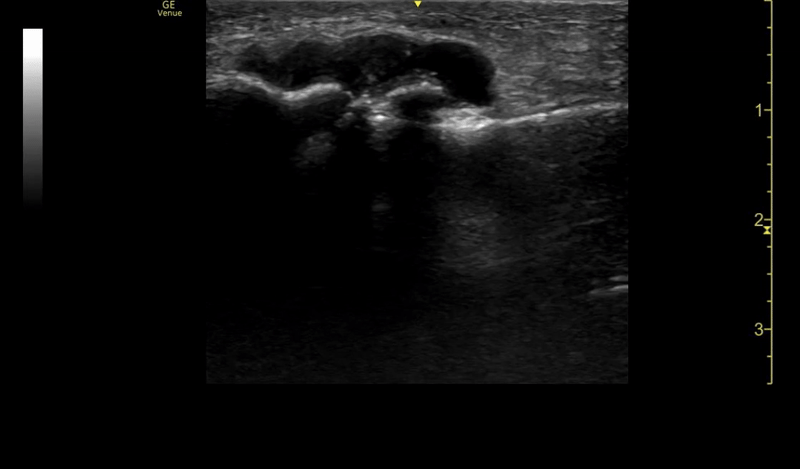 Ultimately, we were successful in obtaining a small amount of fluid for analysis which supported the diagnosis of gout and the patient was able to be safely discharged with a treatment plan and follow up. Consider using ultrasound both to identify the effusion in your next patient with joint pain – and also, in the arthrocentesis itself.