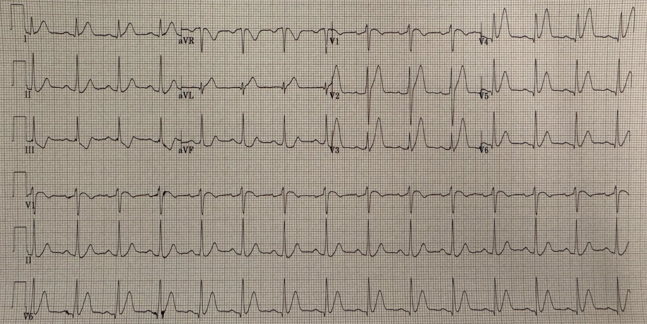 Case: This EKG confirms the findings of the FoCUS exam performed with ST changes consistent with ischemia in the LAD (anterior) distribution in leads V1-V2 with reciprocal changes in the inferior leads II, III, aVF & upsloping ST depressions with peaked T-waves in V3-V6. What is to be made of the upsloping ST depression in the LAD distribution?