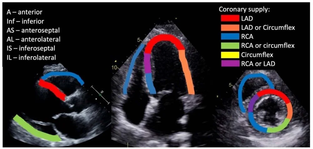 Figure 1. Coronary artery vascular distribution on FoCUS exam (Image from: https://asra.com/news-publications/asra-newsletter/newsletter-item/asra-news/2021/08/02/pocus-spotlight-focused-cardiac-ultrasonography)