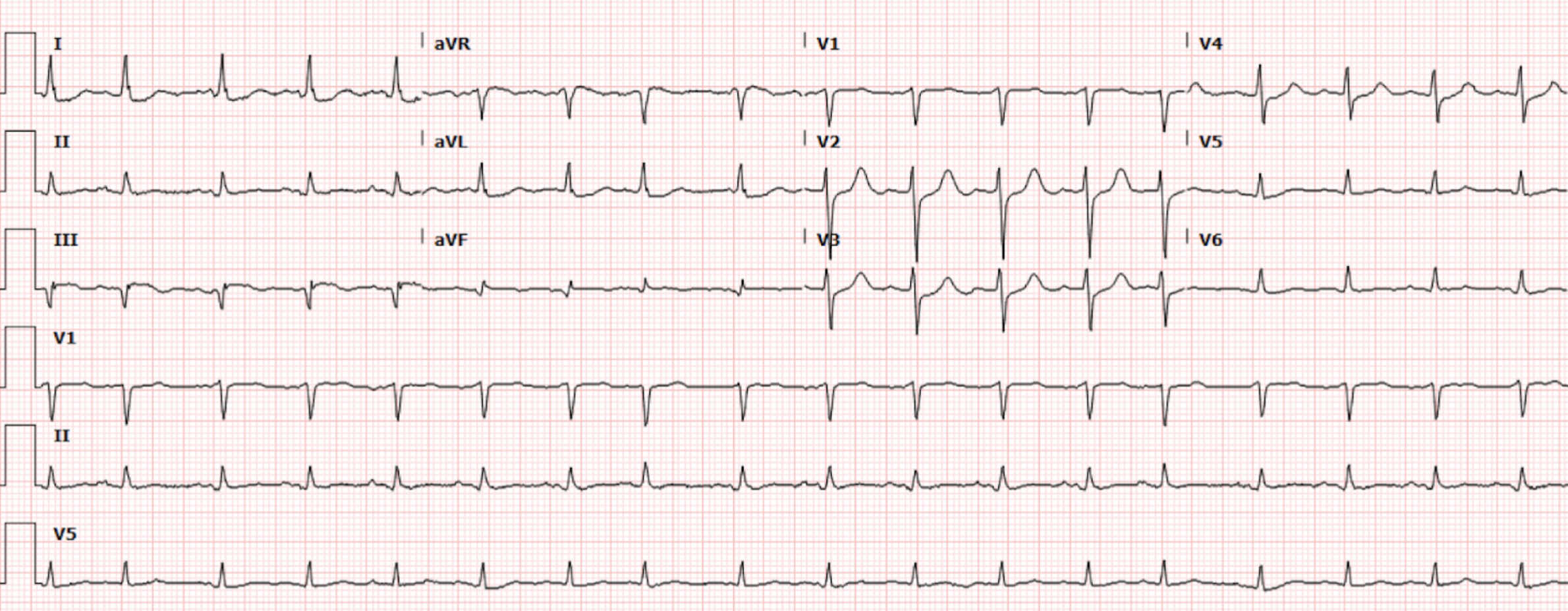 A 53-year-old man with no known medical history presents to the emergency department with three days of progressive shortness of breath and leg swelling. His dyspnea is worse with exertion. He denies chest pain, nausea, vomiting, or diaphoresis. Initial vitals notable for BP 190/95, HR 84, RR 24 and 86% on room air. The patient’s initial EKG (Figure 1) is shown.