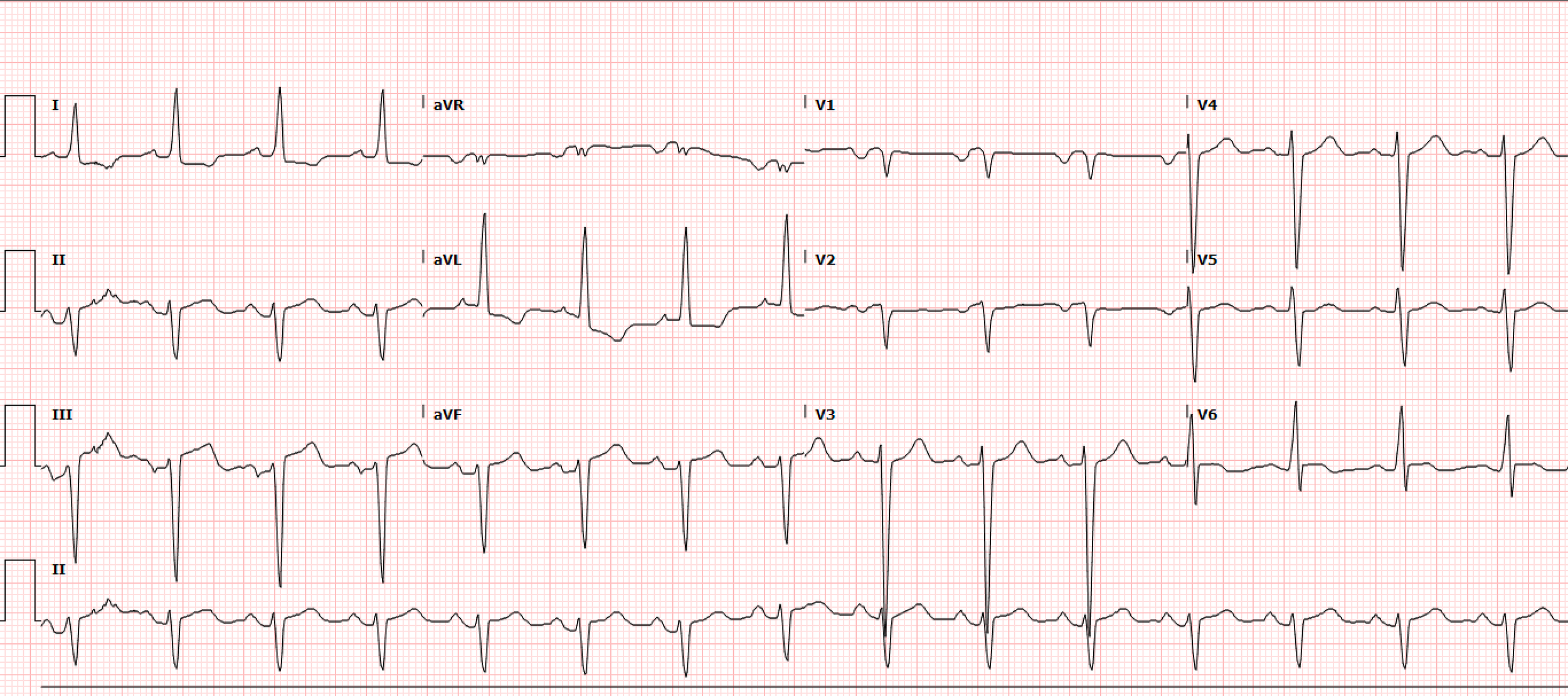 A 25-year-old male with no medical history presents to the emergency department with intermittent chest pain and palpitations. The chest pain is not exertional, positional, or radiating and the patient denies shortness of breath or syncope. The patient does note palpitations associated with lightheadedness.. He denies family history of sudden cardiac deaths. Initial vital signs are notable for BP 129/58, HR 76, RR 18, and O2 saturation of 98% on room air. The patient’s initial EKG (Figure 1) is shown.